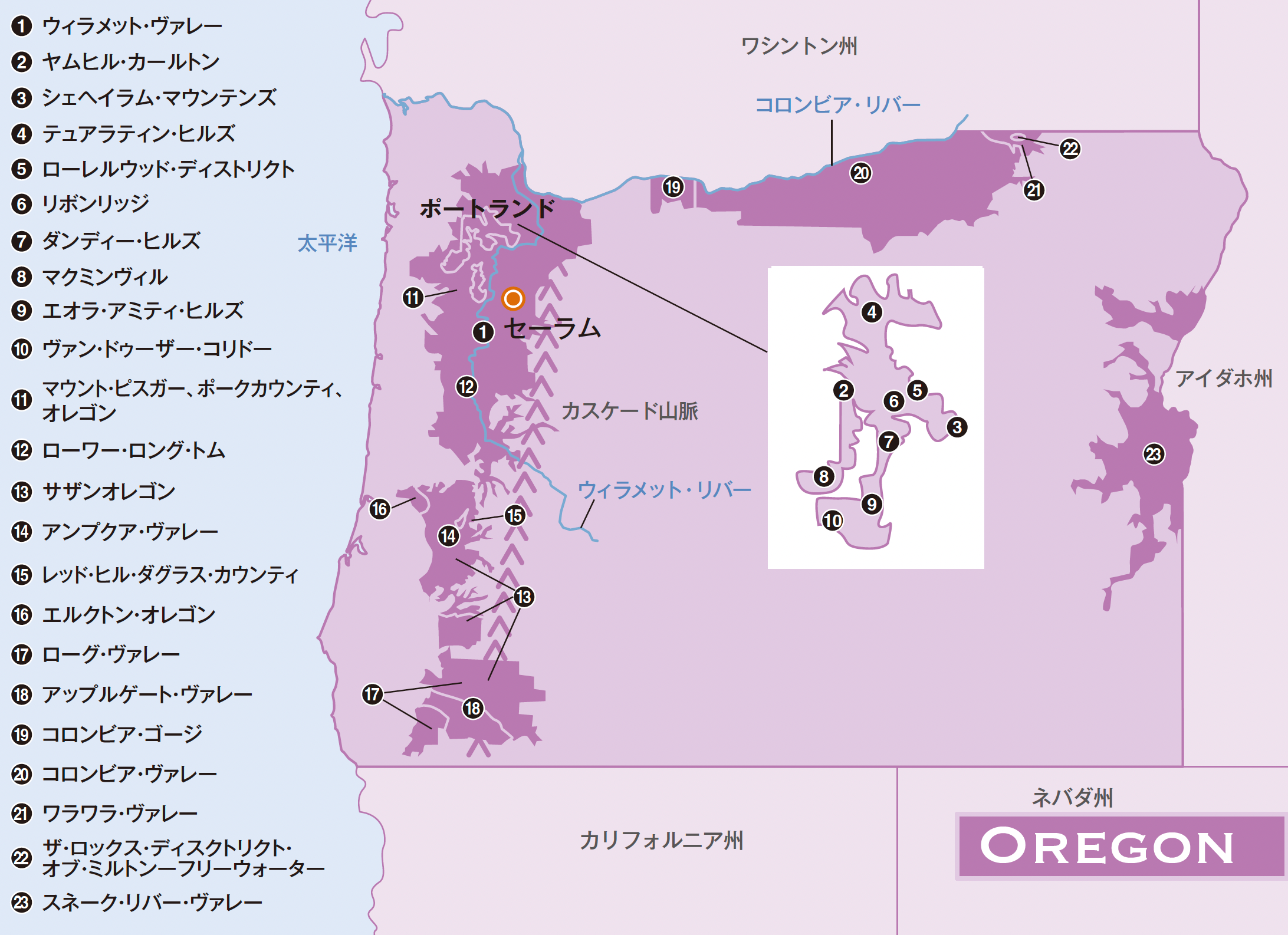 オレゴン州は、カリフォルニア州の北に位置する太平洋に面した州です。北緯45度あたりに位置するウィラメット・ヴァレーは、フランスのブルゴーニュ地方とほぼ同緯度にあり、ワイン産地として冷涼な地域に属しますが、初夏から秋にかけて、ほとんど雨の降らないオレゴンの気候はピノ・ノワールの生産に理想的です。アメリカ国内のワイン生産量においては、カリフォルニア州、ワシントン州、ニューヨーク州に次ぎ第4位で、ぶどう栽培面積約17000ヘクタール(2021)、ぶどう収穫量 114,700トン(2021)です。23のAVAがあり、2021年のデータでは、ピノ・ノワールの生産量が約61%、次いでピノ・グリ17%、シャルドネ7%となります。1058のワイナリーがありますが、年間生産量5,000ケース以下の小規模な家族経営が多く、Sustainability(持続可能性)を大切にし、オレゴン州独自の認証プログラムLIVEやSalmon Safe があり、環境保全型農業をモットーにぶどう作りに取り組んでいます。
