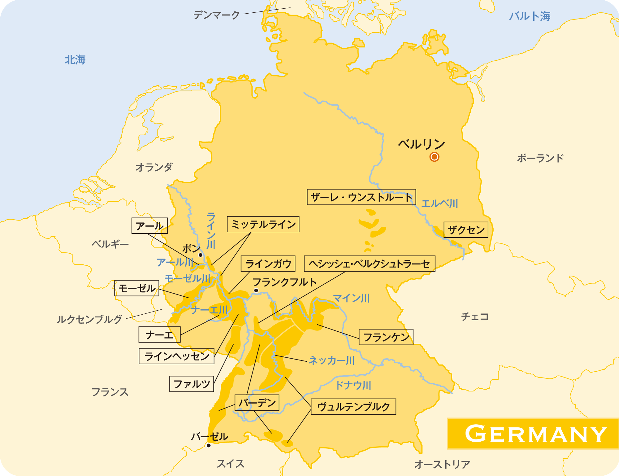 ドイツのワイン生産量は、2021年のぶどう栽培面積10万3千へクタール、2021年の生産量845万ヘクトリットル。白ぶどう67.8%、黒ぶどう32.2%、産地13の地域に分けられ、その殆どが、ライン川の本流とその支流沿岸にあり、それぞれ地域特有の特徴を持っています。主要な品種はリースリング、ミュラー・トゥルガウ、シュペートブルグンダー(ピノ・ノワール)、ドルンフェルダーなどがあります。